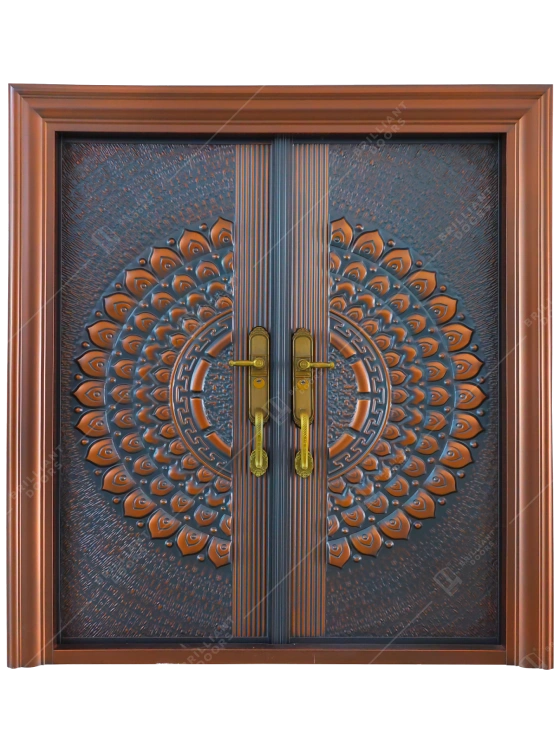 It is a marvelous steel double door with a luxurious touch that feels like a palace door. It offers a tremendous look with double strength, elegance, and safety. The door features a stunning metallic copper colour finish texture, creating an extraordinary entrance. It showcases an intricate peacock feather pattern, adding a sophisticated touch to the design.