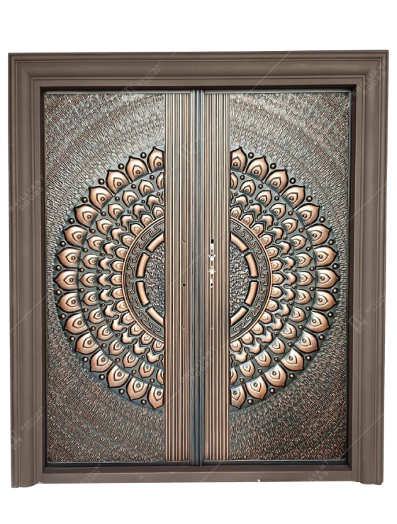 This top quality luxury double door features an exquisite peacock feather pattern with straight vertical lines, giving it a sophisticated and artistic appeal. The paint texture in gold and brown enhances its elegance, making it a perfect fit for grand entrances.