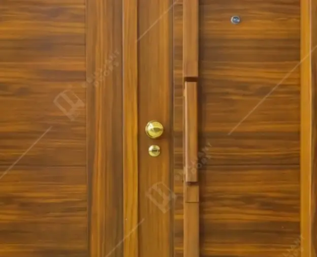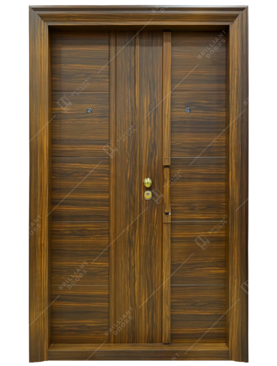 This Premium Steel Double Door features an elegant Brown Teak Wood texture, offering a sleek and modern touch to any entrance. The design incorporates five bold horizontal groove lines, enhancing its contemporary appeal while maintaining a classic wood-inspired aesthetics. Equipped with a fridge-style handle and a ball type SS handle, the door combines functionality with a stylish look.