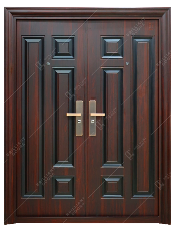 The door design features a Premium Padauk Wood texture finish, offering a luxurious and sophisticated appeal. The design incorporates a classic rectangular pattern with raised panelling, adding depth and elegance to the overall aesthetic. Equipped with two stylish handles on each side, the door enhances convenience and symmetry, providing easy access.