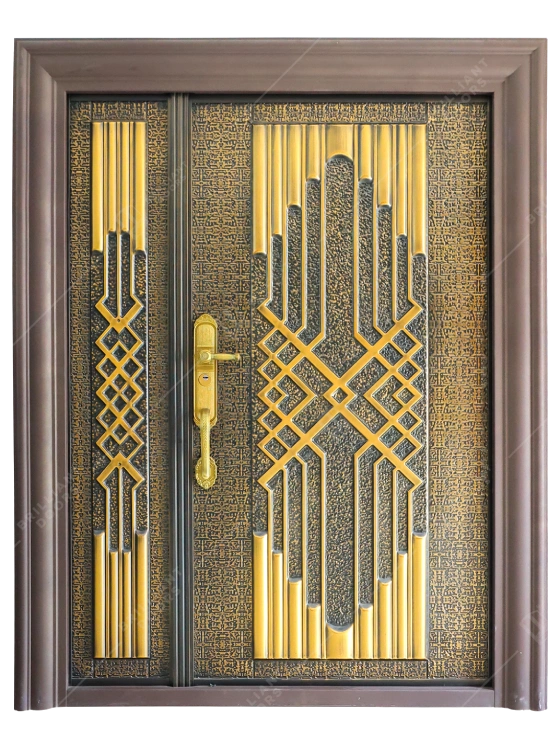 This contemporary luxury door design showcases a striking blend of modern geometry and timeless elegance. The door features a captivating zigzag pattern that adds a dynamic and contemporary touch, perfectly complementing its gold and brown colour texture.