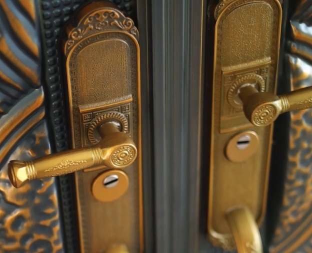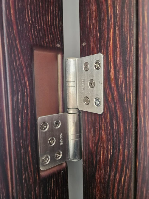 The beautifully designed wooden finish steel door features an elegant Interlaced gold bars pattern, enhancing its luxurious appearance. Designed as a Twin Door, it consists of two separate doors within a single frame. The additional door is equipped with a full stainless steel (SS) grill, functioning like a window that can be opened separately to allow ventilation and visibility while maintaining security. Both doors are equipped with individual locking systems, providing enhanced security and convenience.